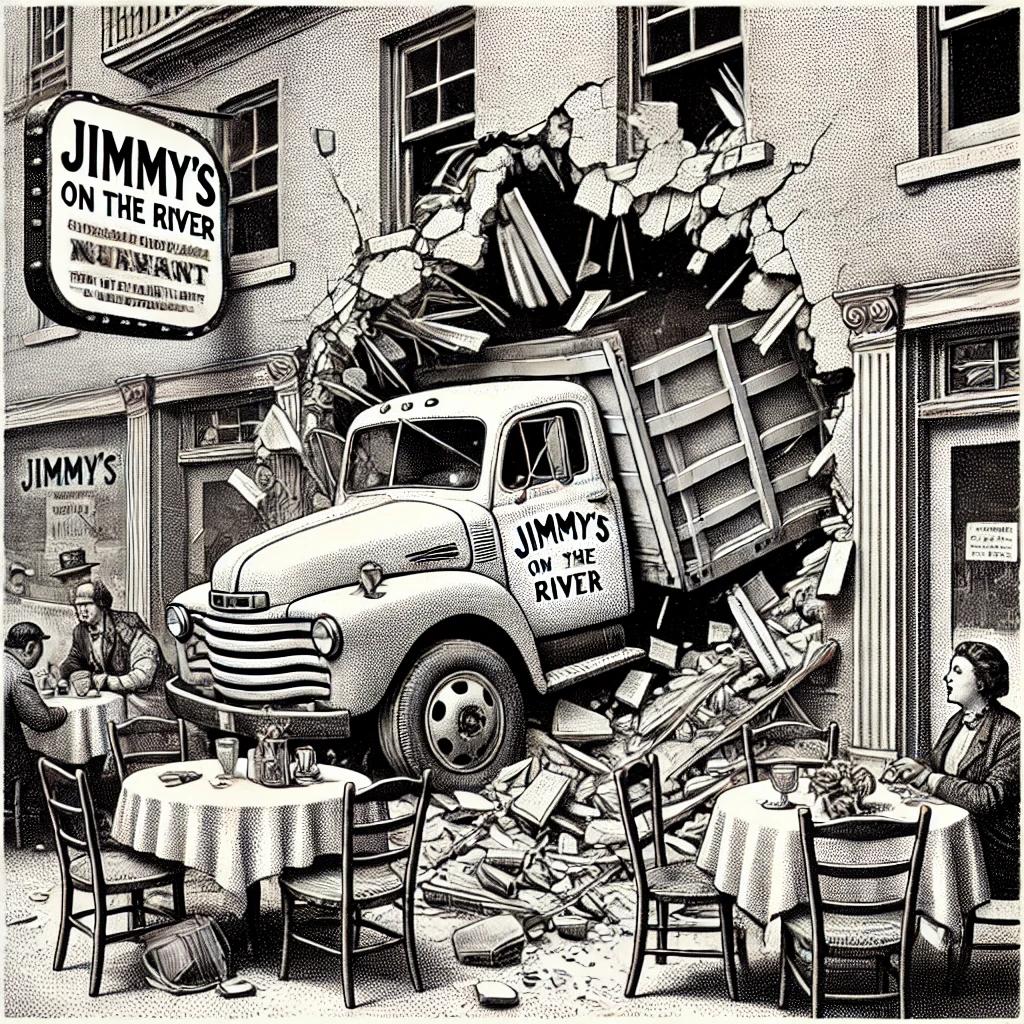 Jimâs wife, Janet Driscoll, confirmed that the driver of the flatbed truck blamed the incident on another motorist who couldnât resist playing a game of “Who Can Get Out of the Way Fastest?” The result was a surprise visit to Jimmyâs that left patrons shaken but thankfully unharmedâminus the unfortunate tables that bore the brunt of the impact.
